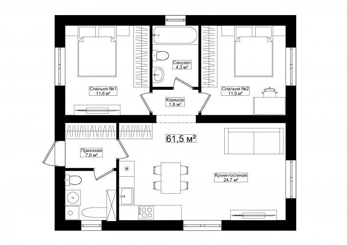 Компактный функциональный одноэтажный дом с оригинальным фасадом и двухскатной кровлей. Имеет 2 планировки две спальни или 3 спальни, кухню гостиную с выходом на террасу, котельную-постирочную, в которой можно разместить второй санузел.