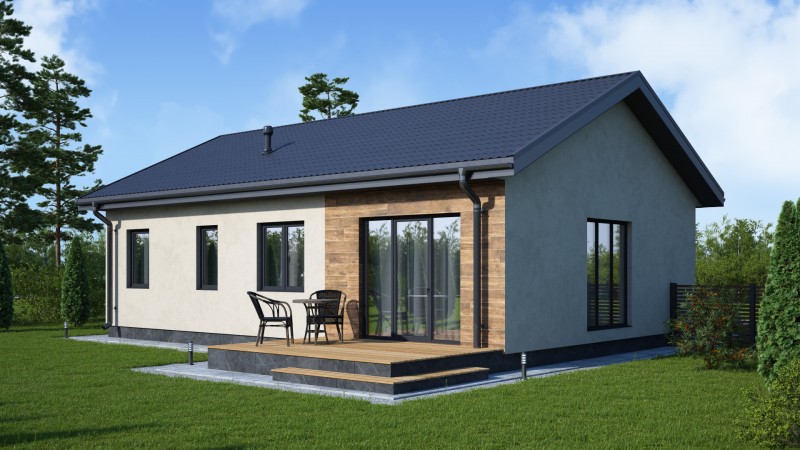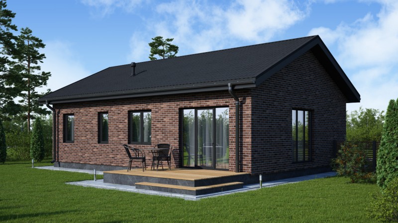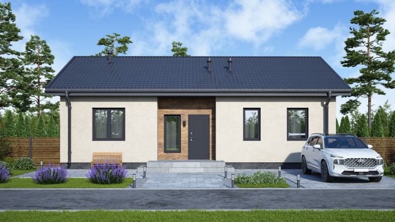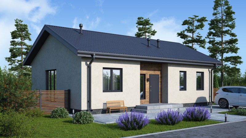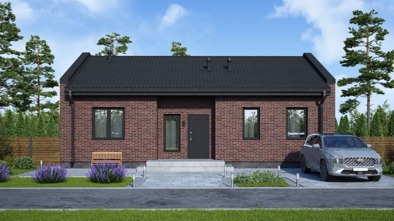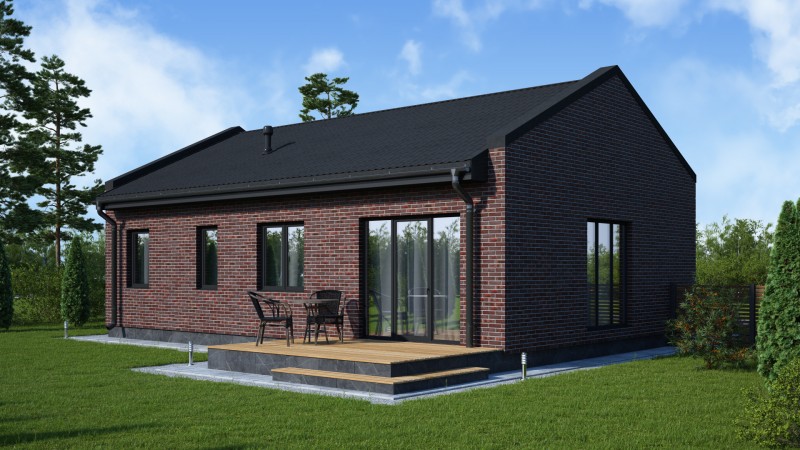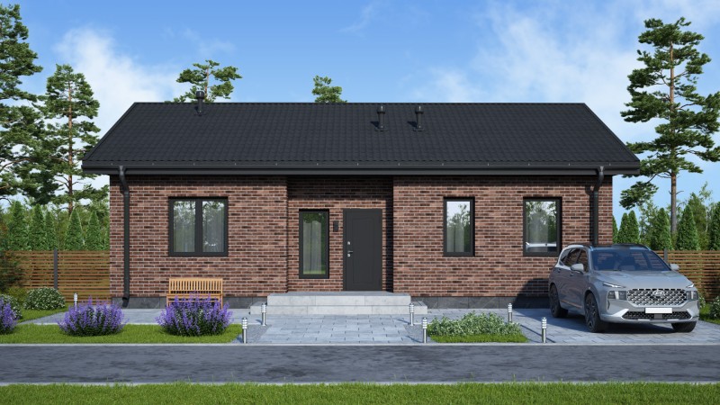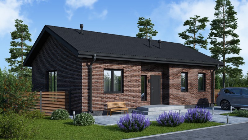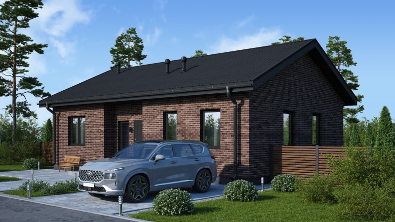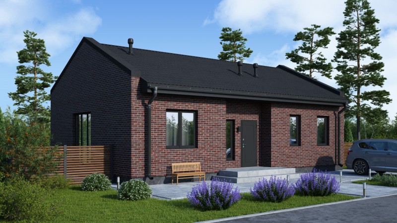 Компактный функциональный одноэтажный дом с классическим комбинированным фасадом и надежной двухскатной кровлей.