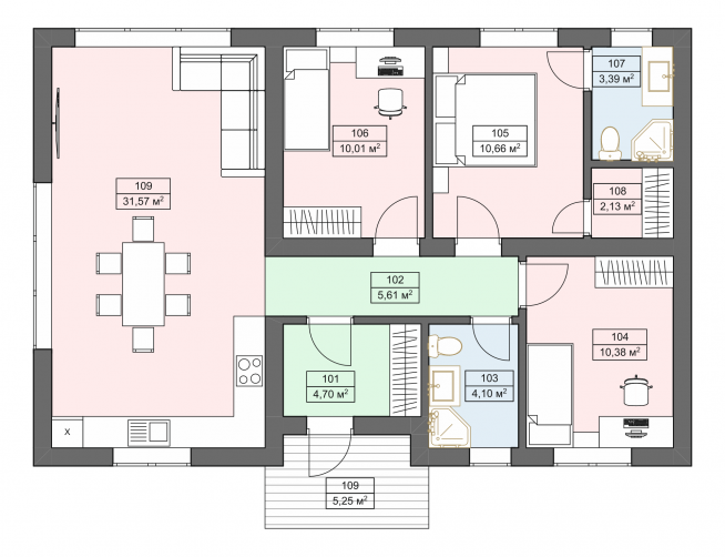 Имеет три спальни, один кабинет, кухню гостиную с выходом на задний двор, второй санузел.
