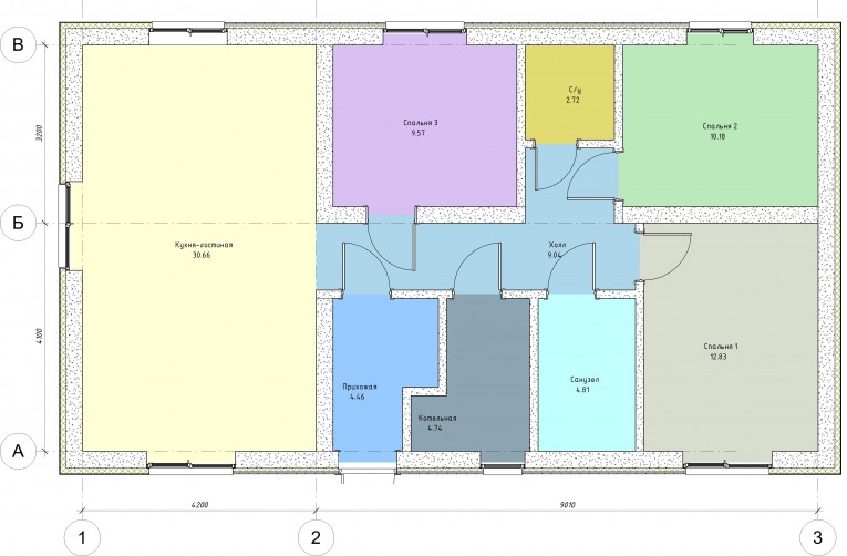 Планировка дома вмещает просторную кухню-гостиную с большими панорамными окнами. В доме три спальни и два санузла.